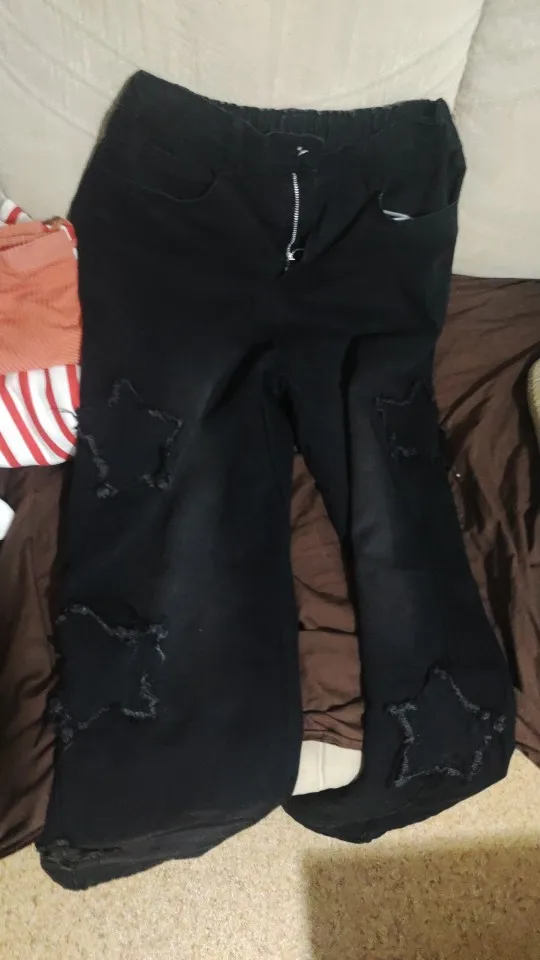 Make a bold statement with these unique gothic-inspired wide leg jeans featuring eye-catching star embroidery. Designed for the modern streetwear enthusiast, these denim trousers blend Y2K aesthetics with contemporary hip-hop fashion.